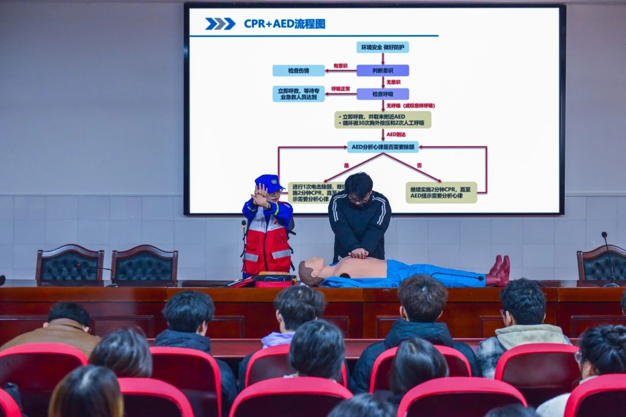 本次宣讲采用“理论讲授+实操训练”方式,吴老师为同学们详细讲解急救措施,利用人体模型进行现场实操演示心肺复苏、AED(自动体外除颤器)使用等技能操作,同学们满怀热忱,认真聆听,与老师积极互动。在老师耐心讲解技术要领后,同学们纷纷参与到实操练习中,他们将带着这份技能,在有需要的时刻挺身而出,及时为他人提供帮助。